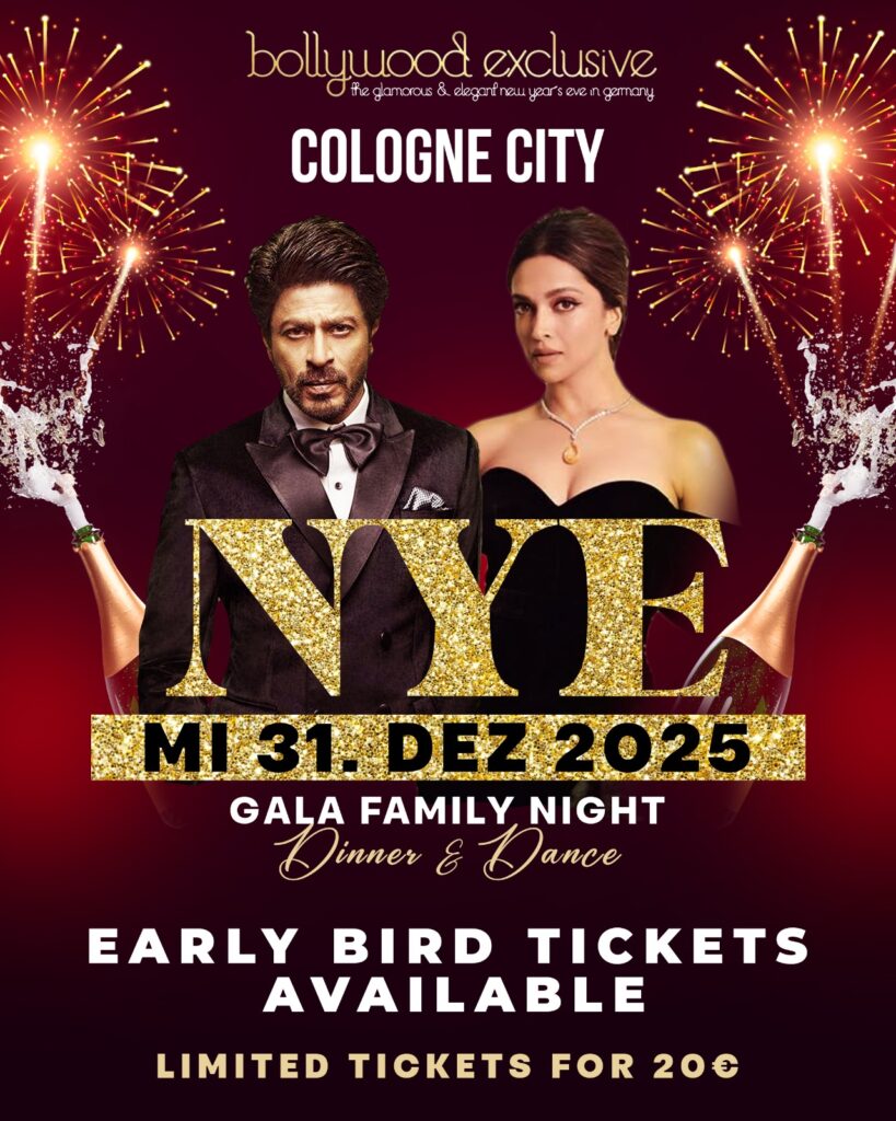 Sichere dir jetzt deine Tickets und sei Teil der größten Bollywood-Silvesterfeier in Köln! Lass uns gemeinsam das neue Jahr mit Tanz, Musik und jeder Menge Spaß begrüßen! 🥳✨ Dresscode: Bollywood Glam – Glitzer, Glamour und Farbe!